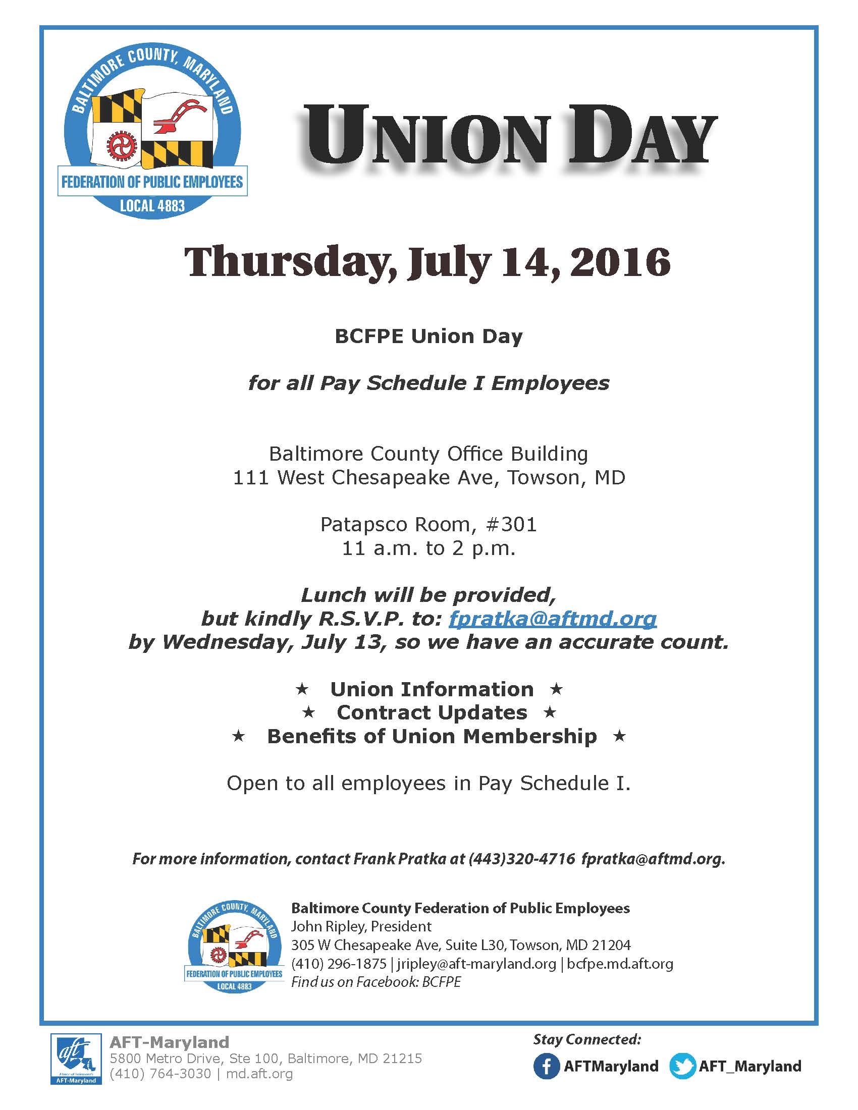 BCFPE Union Day: Thursday July 14, 2016, 11:00 a.m. to 2:00 p.m. at the Baltimore County Office Building, 111 W. Chesapeake Ave., Towson, MD, Patapsco Room #301. Lunch will be provided.